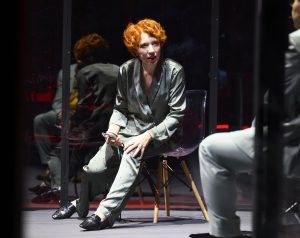 Der Besuch der alten Dame von Friedrich Dürrenmatt Regie: Nuran David Calis Regie: Nuran David Calis Bühne: Irina Schicketanz Kostüme: Johanna Stenzel Musik: Vivan Bhatti Video: Doreen Schuster, Kai Schadeberg, Fabian Polinski Dramaturgie: Benjamin Große Licht: Jörn Langkabel Auf dem Bild: Bettina Schmidt, Roman Kanonik Foto: Rolf Arnold Honorarfrei