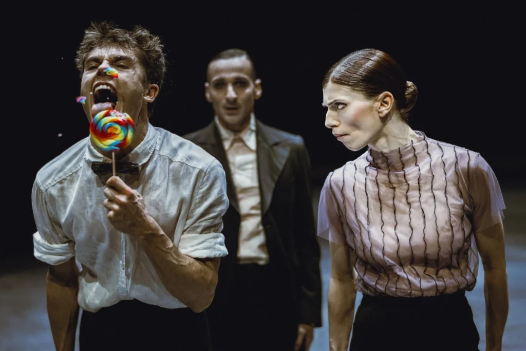 Die Bühne bleibt radikal reduziert (Bühne und Kostüme: Michaela Springer). Requisiten im herkömmlichen Sinne fehlen; einzig ein rotes Geschenkband zieht sich als wiederkehrendes Motiv durch den Abend. Es umschlingt, trennt, bindet und markiert Beziehungen, ohne je konkret zu werden. Die Kostüme zitieren klassische Ballettformen, sind jedoch in Farbigkeit und Linienführung bewusst verfremdet und unterstützen die nervöse Körpersprache, statt sie zu dekorieren. Die Körper wirken exponiert, verletzlich und zugleich bis zur Überdehnung gespannt.