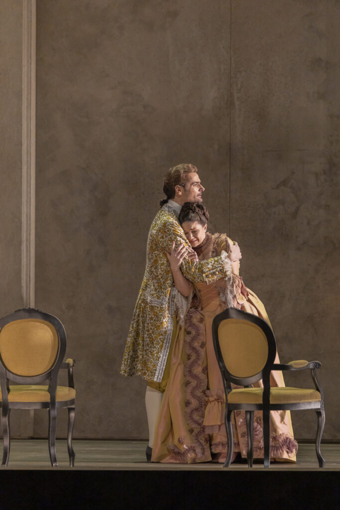 Schmale französische Fenster oder ein langgestreckter, vertikal betonter Durchgang eines Rokoko-Schlosses deuten die wechselnden Handlungsorte an.