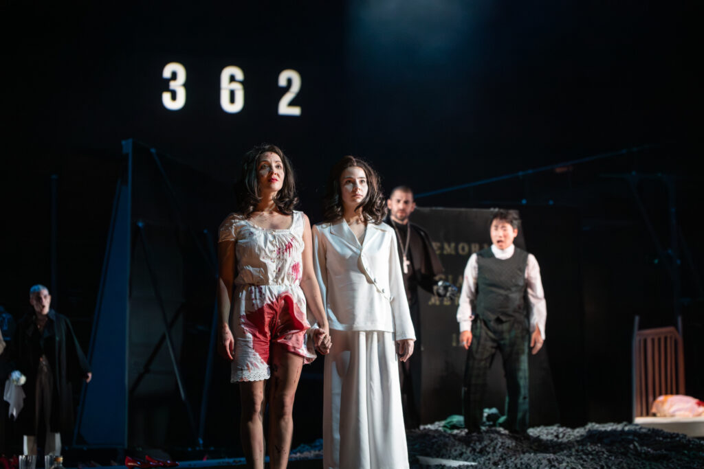 Großzügig, aber etwas überdeutlich streut die Inszenierung Symbole für ihre feministische Lesart: Immer wieder erscheint groß die Zahl 360. Sie erinnert an die im Jahr 2023 gezählten Femizide. „Lucia di Lammermoor“, eine absurde Romanze aus dem 18. Jahrhundert, wird so einerseits wohltuend begradigt, andererseits mit neuen Symbolen aufs Neue bedeutungsschwanger aufgeladen.