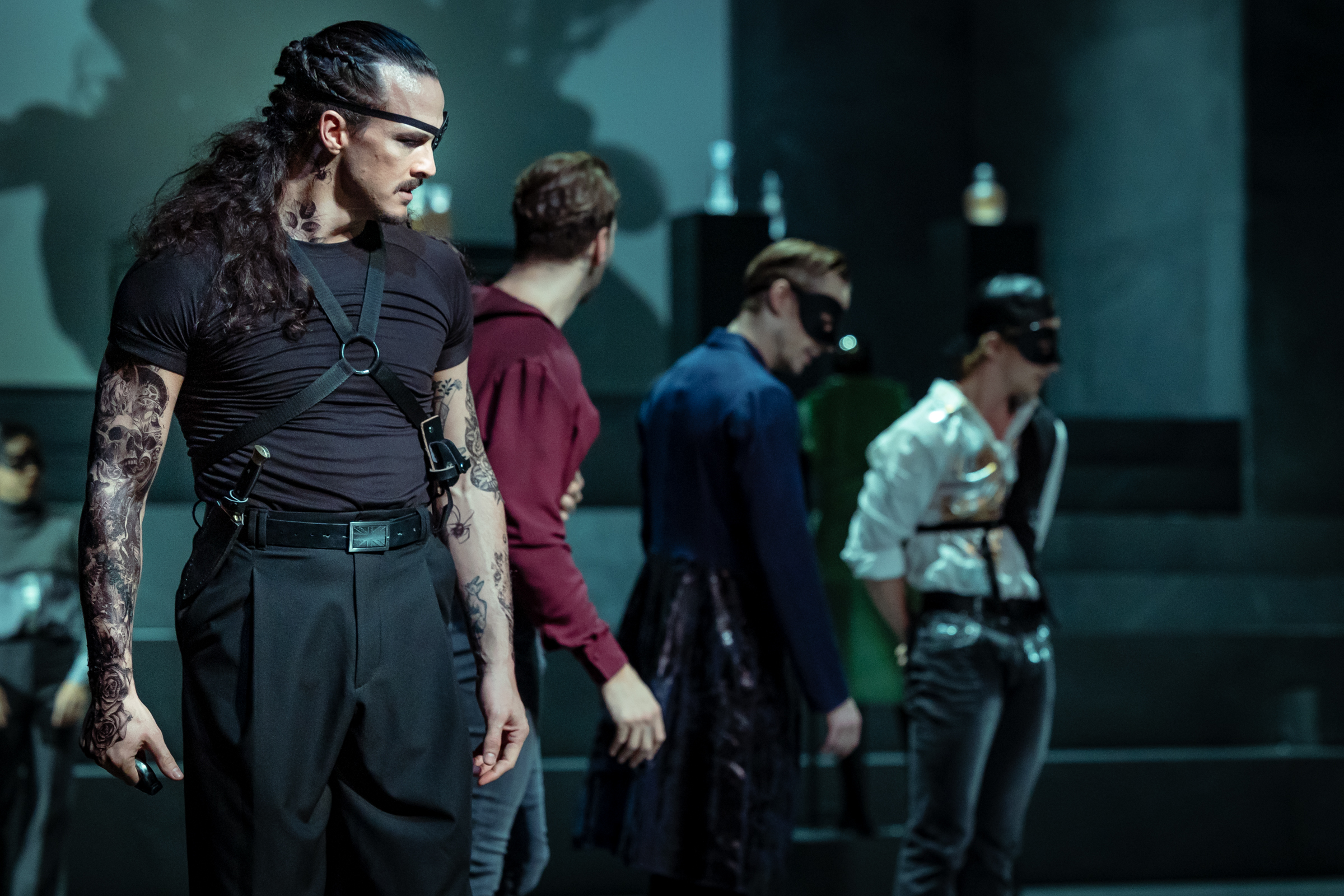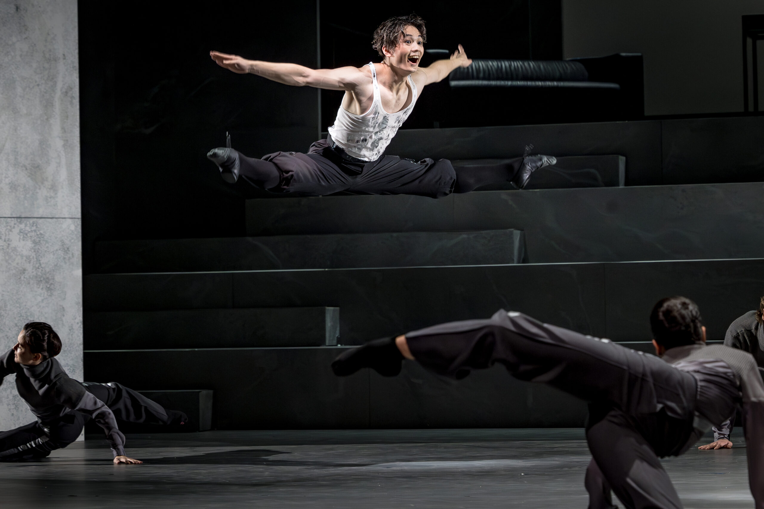 Mrs. Capulet stützt sich im Geschäft vollständig auf Tybalt (Patrick Michael Doe). Dank seiner natürlichen Türsteher-Qualitäten hat er sich bei den Capulets zum Mann fürs Grobe qualifiziert. Er befindet sich im Dauerclinch mit dem aufgedrehten Mercutio von gegenüber (Haruto Goto), der fiebrig, federnd, quirlig und sprungstark eine ganz große Leistung zeigt. Wie auf Crystal Meth provoziert er immer wieder den Türsteher des Konkurrenten und nervt ohnehin alle. Die wirbelnden Kampfszenen und die gestisch eruptiven Tänze der außer sich geratenden Männerwelt prägen sich tief ein.