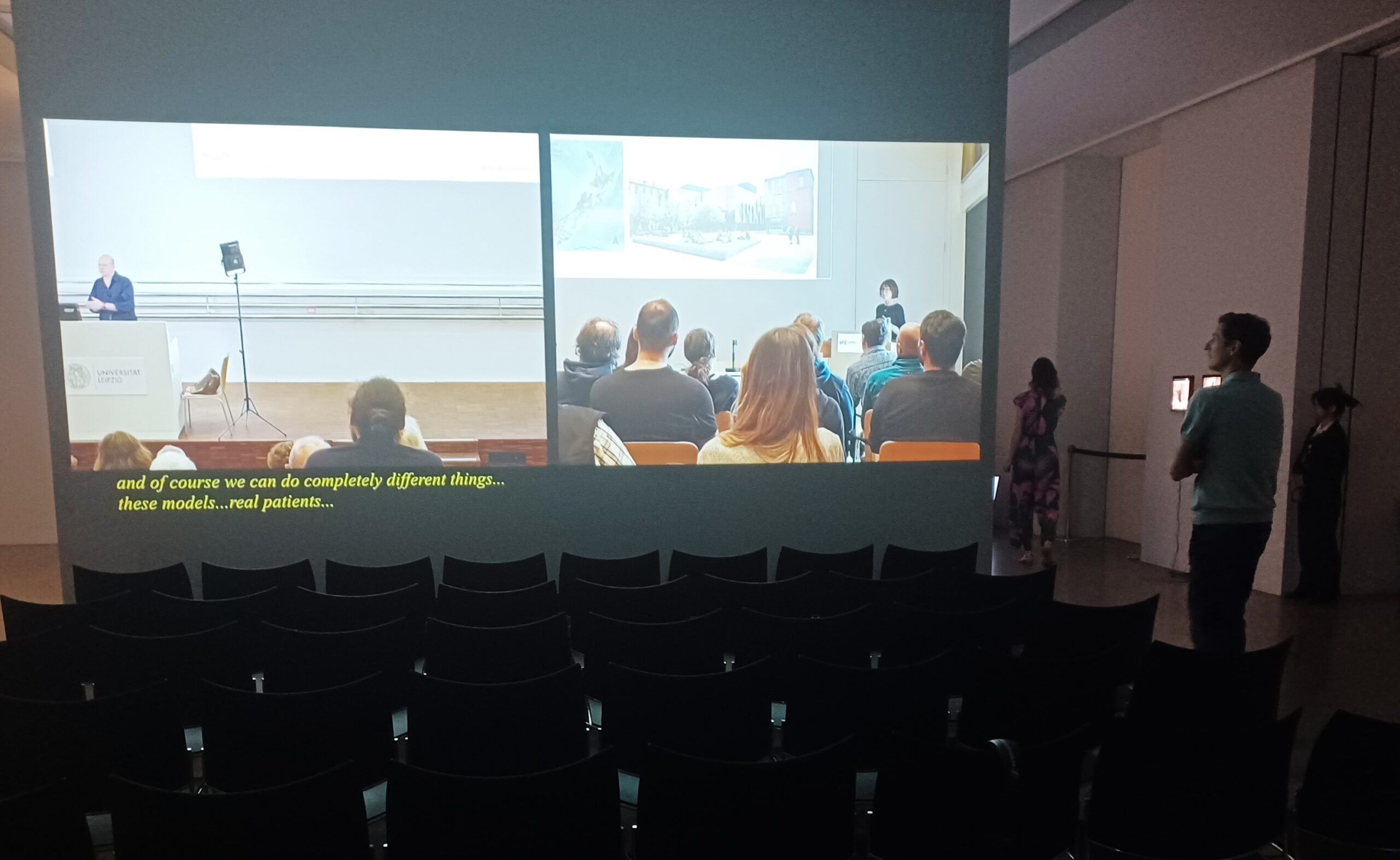Auf zwei Bildschirmen sieht man wissenschaftliche oder künstlerische Konferenzen, bei denen plötzlich professionell schauspielende Akteure in die Versammlung eintreten und beginnen, mit großer Selbstverständlichkeit dramatische Texte zu sprechen. Die Reaktionen der Anwesenden – befremdet, irritiert, interessiert – erzeugen ein doppeltes Spiel von Inszenierung und Realität. Die kunstvoll montierten Videoebenen führen Theater und Alltag als zwei sich bedingende theatralische Ebenen vor.