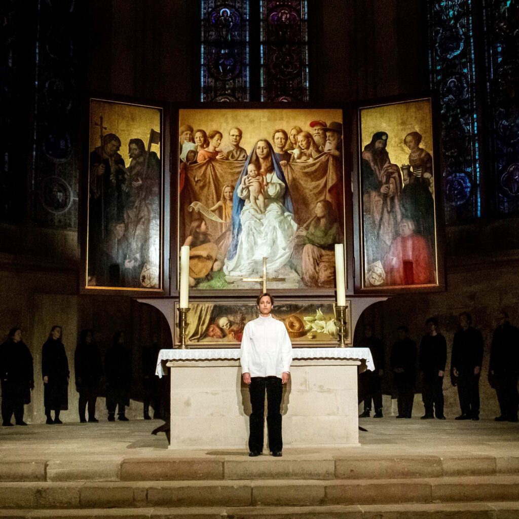 Der starke Eindruck, den das theatralische Erlebnis insgesamt hinterlässt, speist sich auch aus dem wunderbaren Gesang des Kammerchores. Namen und Beiträge lassen sich nicht nennen. Das Programmheft war zur Aufführung nicht greifbar. Auf jeden Fall harmonisiert der Kammerchor selbst die heiklen Momente im Westchor. Nicht wenige bezeichnen das Triegel-Marienaltar-Bild zwischen den Stifterfiguren als aggressiv kitschig. Auch so ein Glaubenskrieg unserer Zeit.