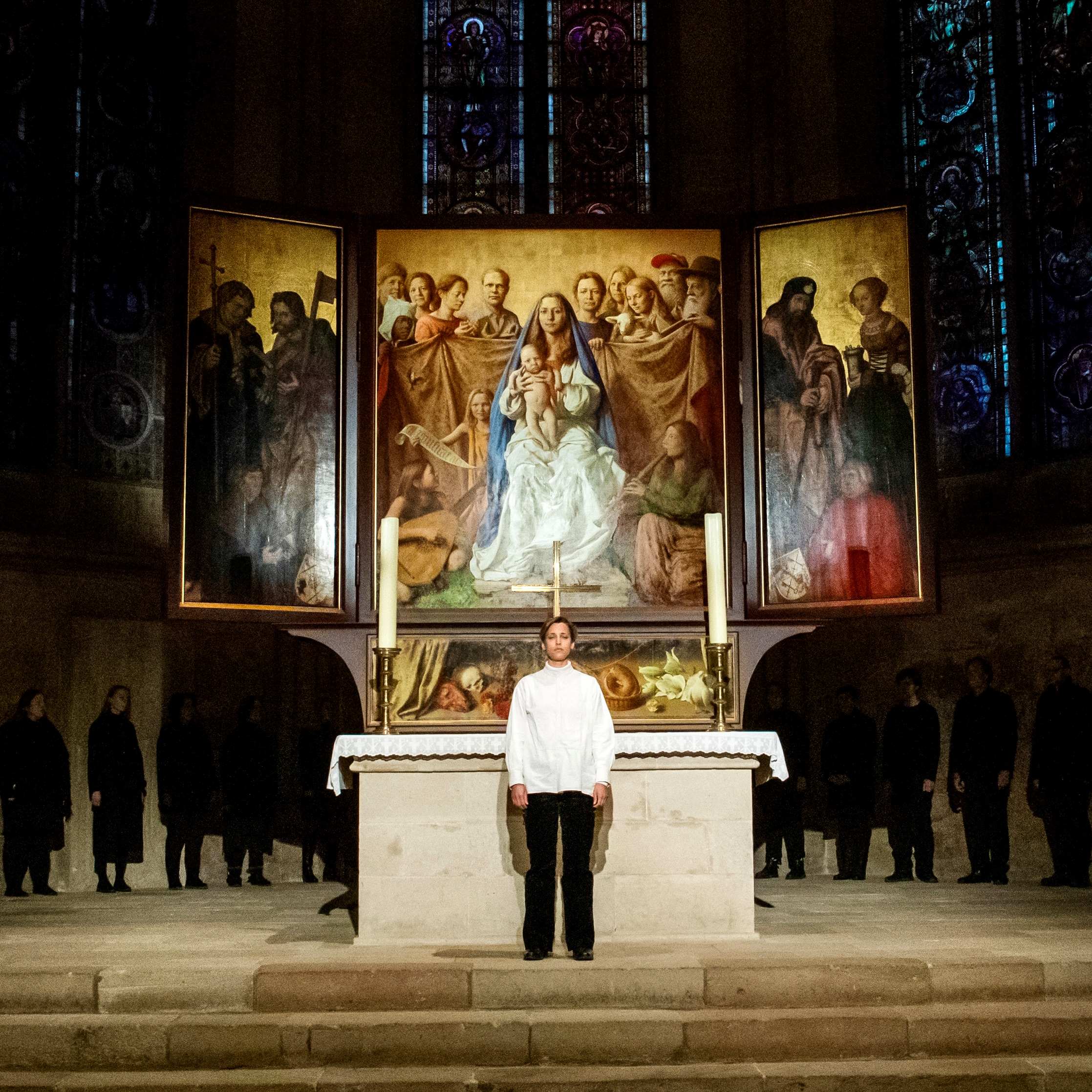 Der starke Eindruck, den das theatralische Erlebnis insgesamt hinterlässt, speist sich auch aus dem wunderbaren Gesang des Kammerchores. Namen und Beiträge lassen sich nicht nennen. Das Programmheft war zur Aufführung nicht greifbar. Auf jeden Fall harmonisiert der Kammerchor selbst die heiklen Momente im Westchor. Nicht wenige bezeichnen das Triegel-Marienaltar-Bild zwischen den Stifterfiguren als aggressiv kitschig. Auch so ein Glaubenskrieg unserer Zeit.