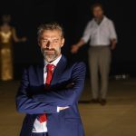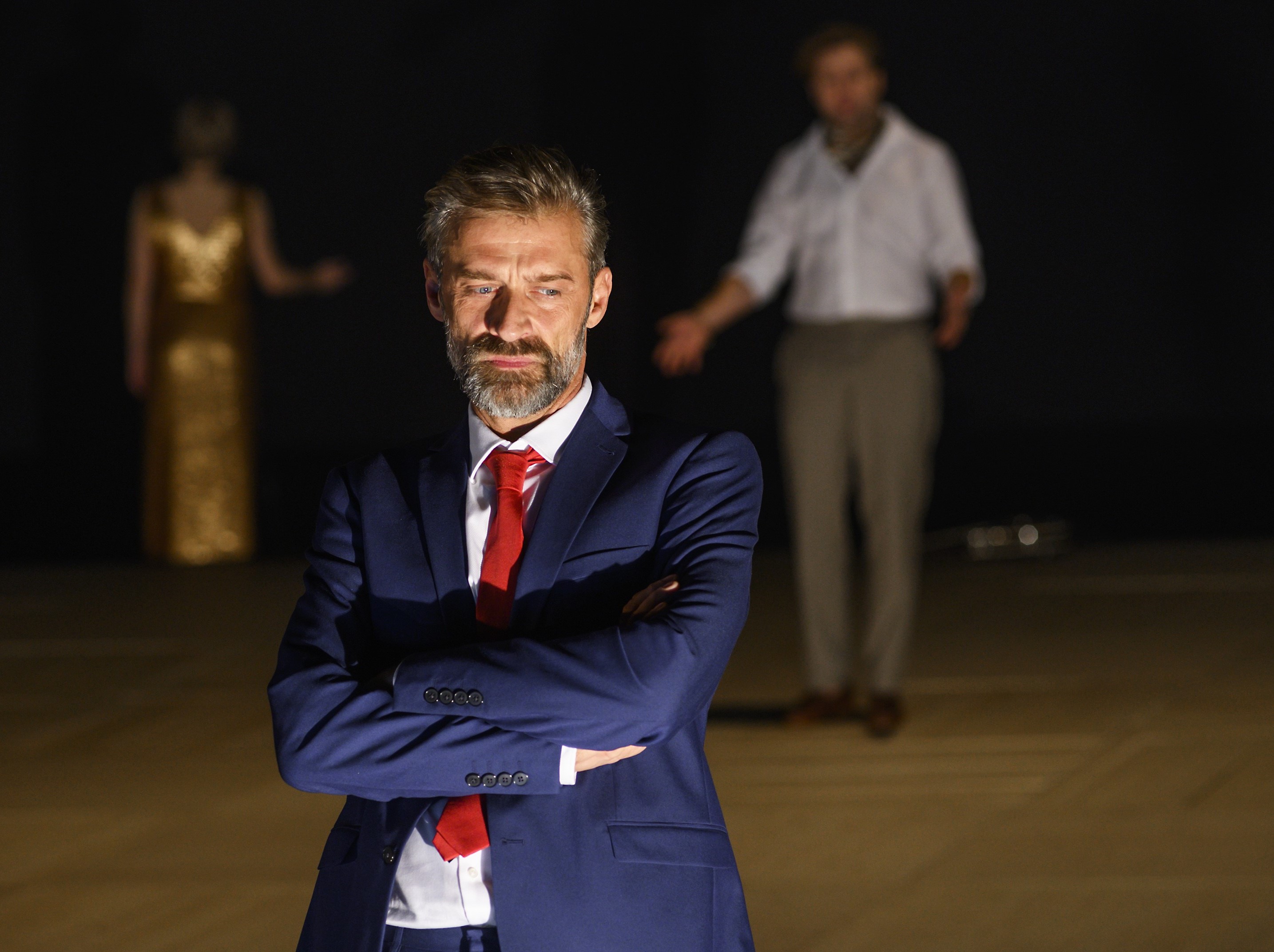 Dirk Lange und Bettina Schmidt zeigen das Herrscherpaar nuancenreich und als Menschen. Da ist für Heldenkult gar kein Platz. Julian Kluge, Thomas Braungardt und Paul Trempnau (im Original Markus Lerch, aber den hatte ein Hexenschuss niedergestreckt) assistieren den beiden und tun das mit Engagement und vollem Körpereinsatz, sind aber aufgrund der Logik der Inszenierung ein wenig in ihren Entfaltungsmöglichkeiten beschnitten. Die Bühne ein Holzpaneel (entworfen vom Regisseur), das im Kriege bricht – tolle Idee, die großen Raum für die Charakterentwicklungden Mimen lässt. Die Kostüme von Kamila Polívková holen das antike Geschehen hinein in die Gegenwart mit schnieken Anzügen und blitzenden Schuhen, grad so wie die Mächtigen heut vor uns hintreten. Auch deswegen erlahmt manch gehaltener Monolog nicht. Leutselig werden Geschenke verteilt, Alkohol hilft da immer. Und da die Akteure zu Beginn aus dem Publikum treten, ist dem die Distanzierung schwer möglich.