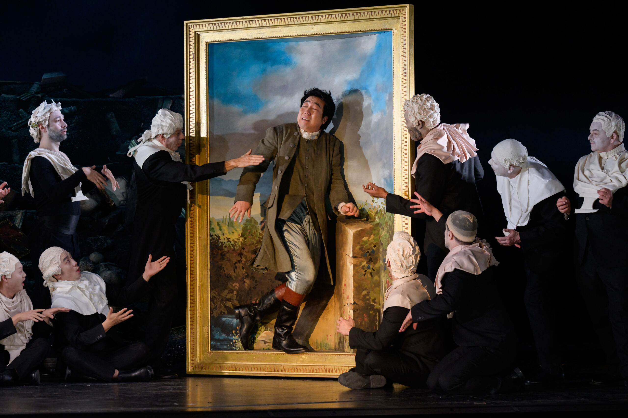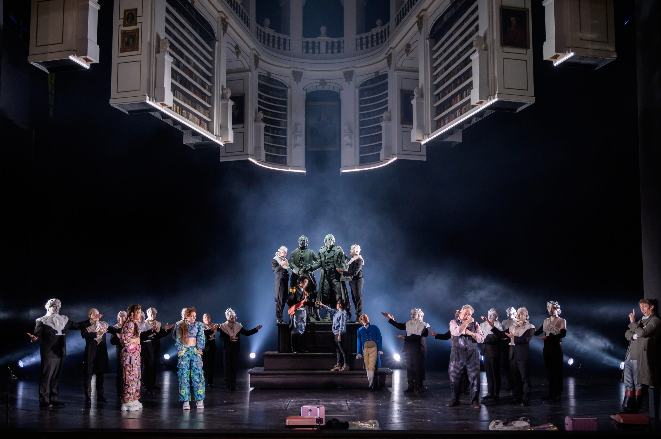 Der Hofphilosoph Alidoro steigt aus Tischbeins Gemälde wie Goethe aus der Campagna zurück an den Weimarer Hof. Nach dem Kleidertausch mit dem Prinzen Ramiro trägt sein Kammerdiener Dandini die gleiche Paradeuniform wie Goethes Freund und Dienstherr Carl August. Angelina erscheint auf der oberen Galerie der Bibliothek in einer Hoftracht des späten 18. Jahrhunderts wie Anna Amalia. Es geht nicht um die historische Stichhaltigkeit und theatrale Wirklichkeitsbelastung dieser Figuren, sondern um Poesie und Verklärung. Bei ihrem quirligen Duett werfen Prinz und Diener mit Goethe-Zitaten auf Texttafeln um sich. Mit etwas Witz wird da die Bildungsgloriole des Aufführungsortes verherrlicht, aber zugleich nicht ganz ernst genommen. Und es ist ein schönes Bild, wenn in die Bibliothek auch noch das Goethe-Schiller-Denkmal vom Theaterplatz hineinsinkt. Gabriele Rupprechts Kostüme schweben dazu zwischen Goethezeit und Gegenwart. Der von Emanuel Winter einstudierte Herrenchor trägt weiße Büsten aus der Bibliothek als Gesichter.